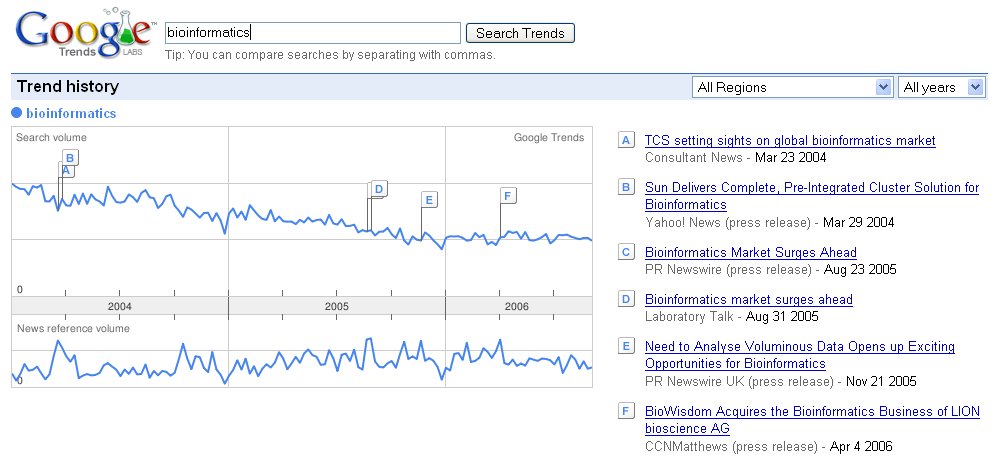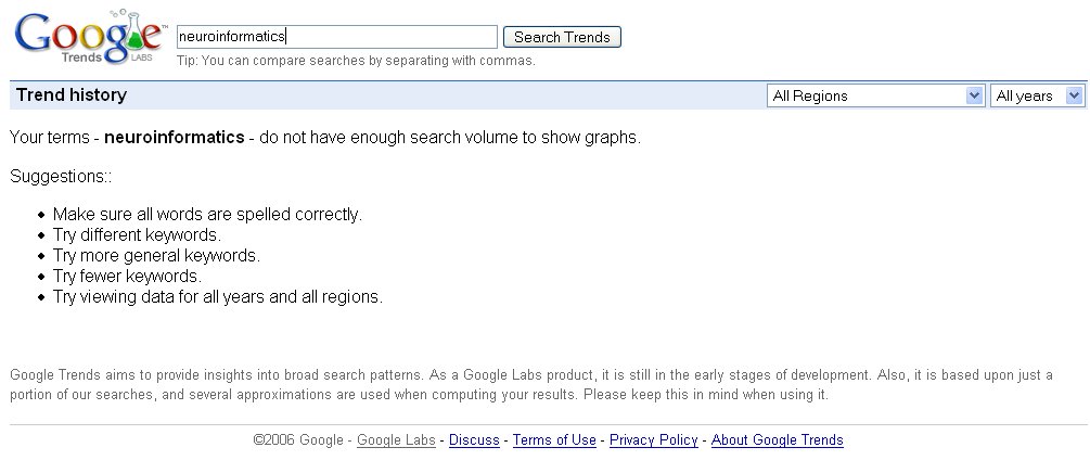 Just as a matter of interest I thought I would compare bioinformatics and neuroinformatics on Google Trends. Looks as if I have plenty of work to do!